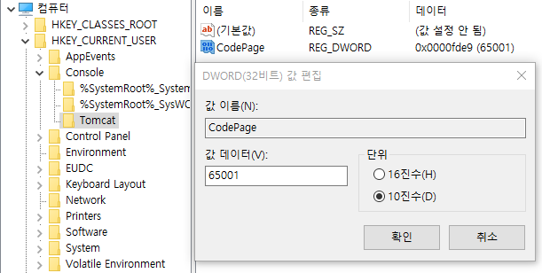 Tomcat(새로만들기 DWORD추가후 CodePage생성) - 단위:10진수, 값데이터:65001 확인